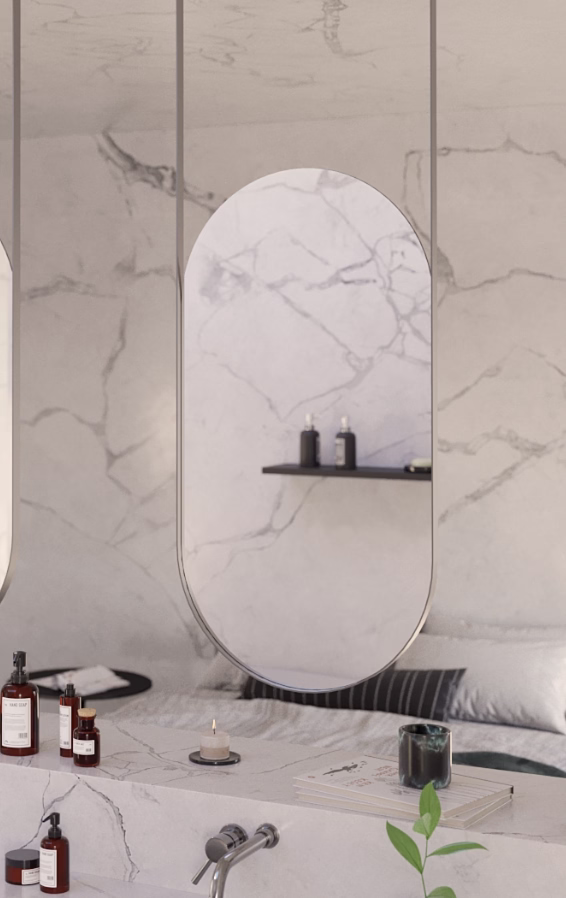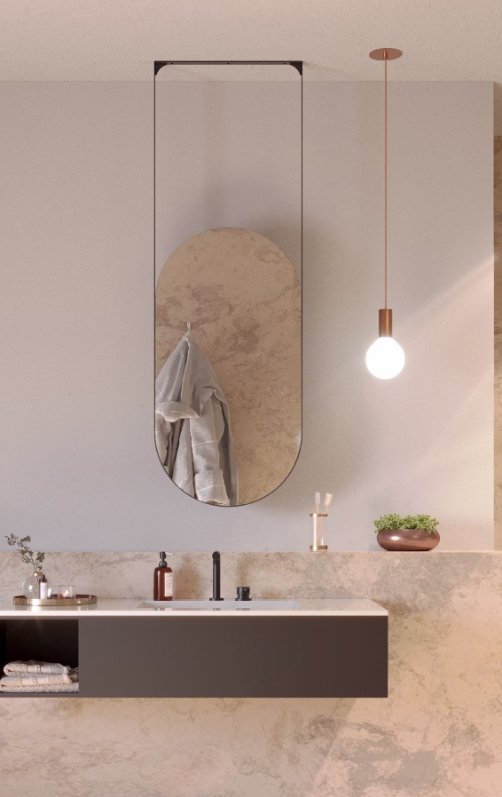 Il TAMAGO HANG nasce dall’esigenza di poter appendere lo specchio direttamente al soffitto. Grazie alle staffe di supporto nella stessa finitura e struttura della specchiera, è possibile porre in sospensione il TAMAGO HANG. Questa soluzione permette di strutturare i sistemi costruttuvi contemporanei migliorando gli spazi e garantendo un’estetica lineare.