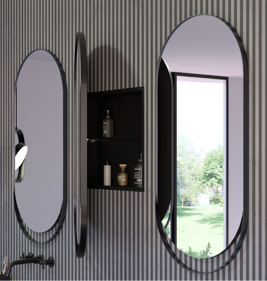 La specchiera TAMAGO WALL nasce dall’esigenza architettonica di incassare la parte parte contenitiva. Questo modello mantiene le misure dell’anta del TAMAGO classic. Il vano contenitivo invece può essere incassato a parete: che essa sia una legno, OSB, cartongesso o simili.
