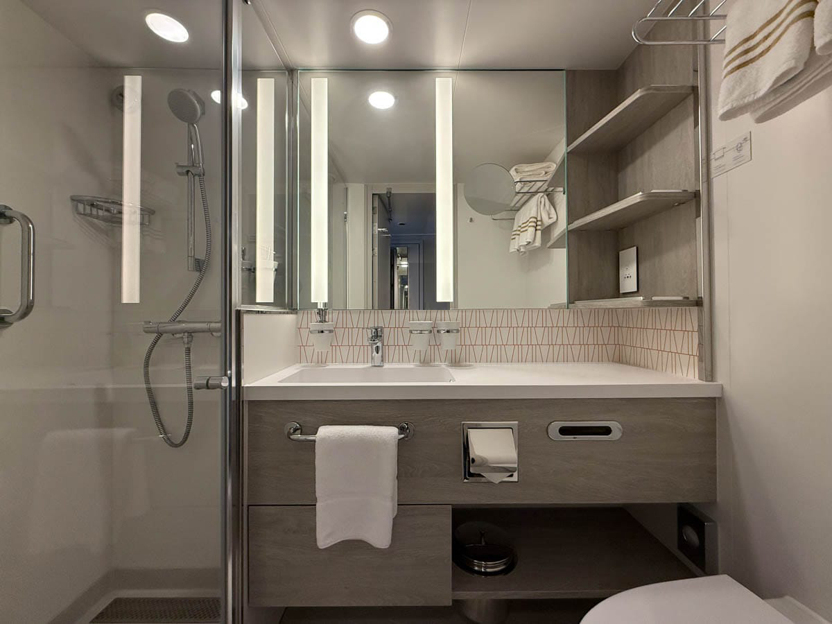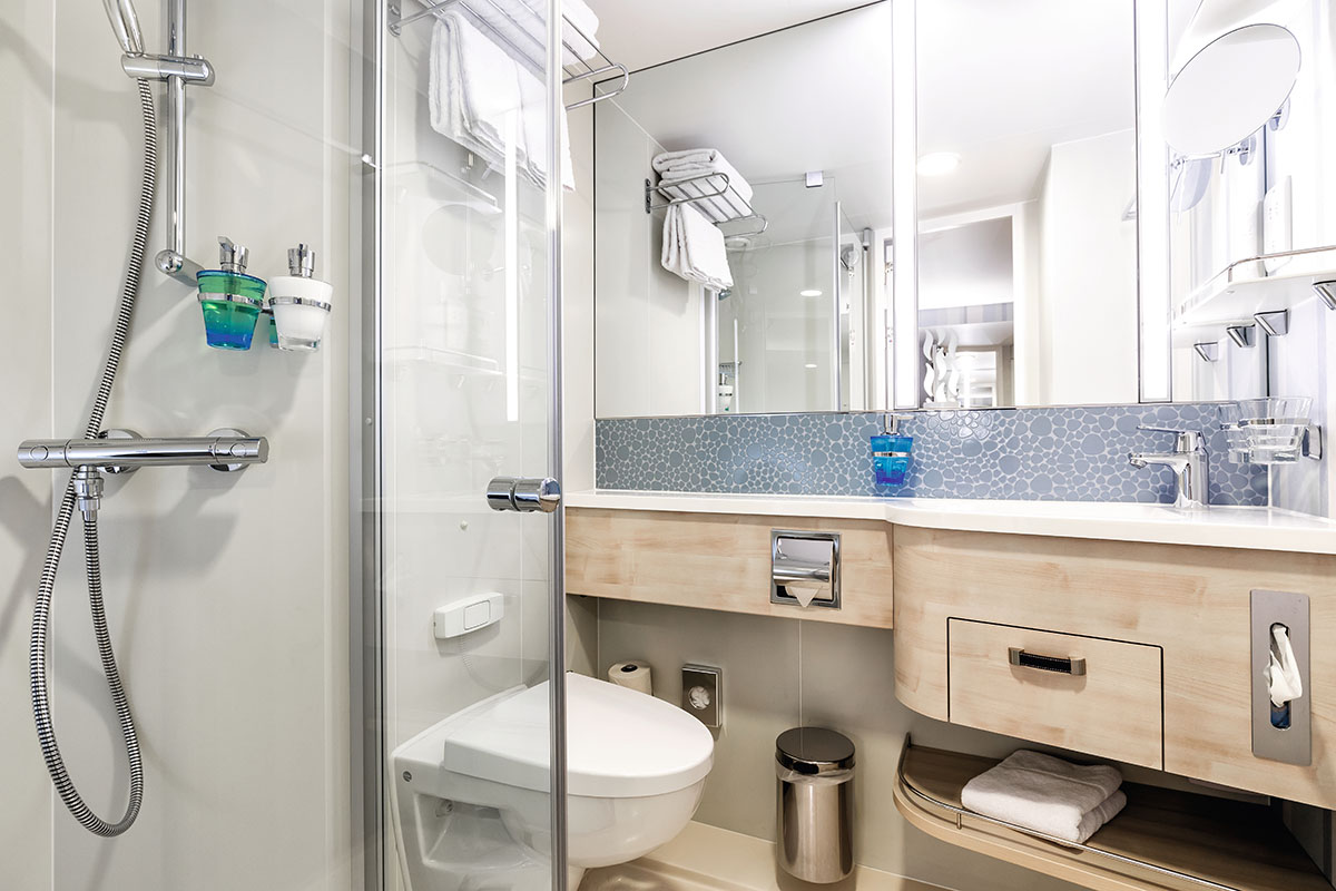 Lo specchio progettato per conto di Fincantieri e prodotto da DDL per la nave da crociera TUI ONE della TUI Cruises è dotato del brevetto DDL “FLY”. Questo nuovo sistema di apertura è ideale per specchi in nicchie o spazi ristretti. È incluso anche un ingranditore da 20 cm, applicato direttamente sul retro dello specchio grazie ad un sistema di rimozione dell’argentatura.